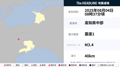 8月4日8時37分頃、香川県・高知県で最大震度1の地震を観測