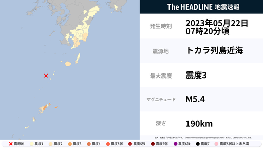 5月22日7時20分頃、鹿児島県で最大震度3の地震を観測