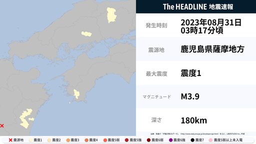 8月31日3時18分頃、岡山県・広島県などで最大震度1の地震を観測