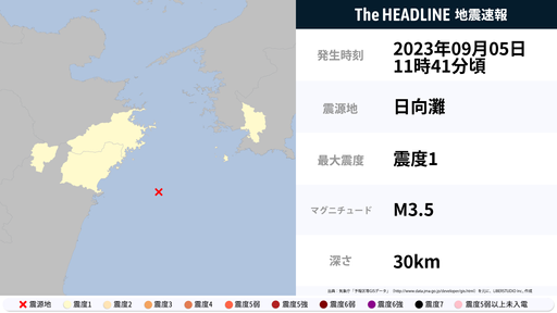 9月5日11時41分頃、高知県・大分県などで最大震度1の地震を観測
