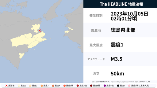 10月5日2時1分頃、和歌山県・徳島県などで最大震度1の地震を観測