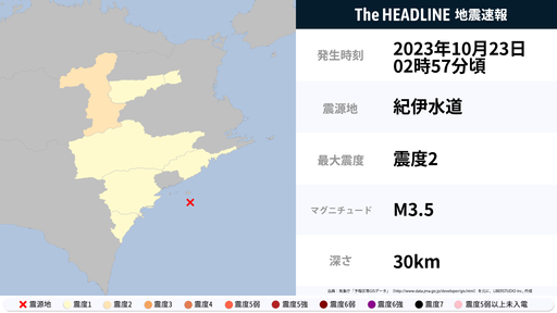 10月23日2時57分頃、徳島県で最大震度2の地震を観測