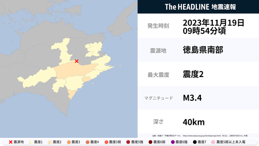 11月19日9時54分頃、徳島県・高知県で最大震度2の地震を観測
