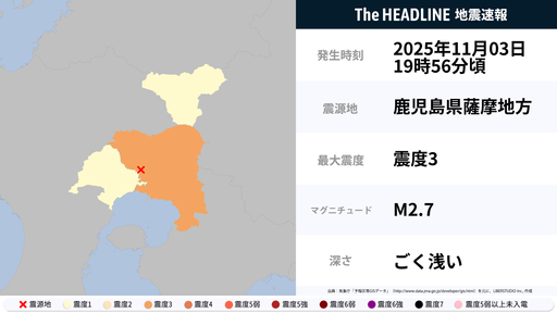 11月3日19時56分頃、鹿児島県で最大震度3の地震を観測