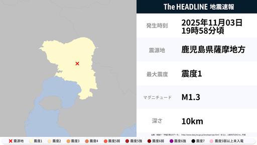 11月3日19時58分頃、鹿児島県で最大震度1の地震を観測