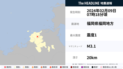 2月9日7時19分頃、福岡県で最大震度1の地震を観測
