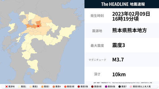 2月9日16時19分頃、熊本県で最大震度3の地震を観測