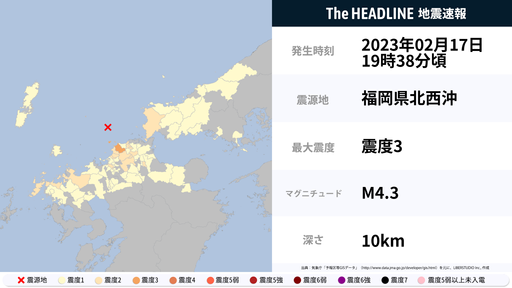 2月17日19時38分頃、福岡県で最大震度3の地震を観測