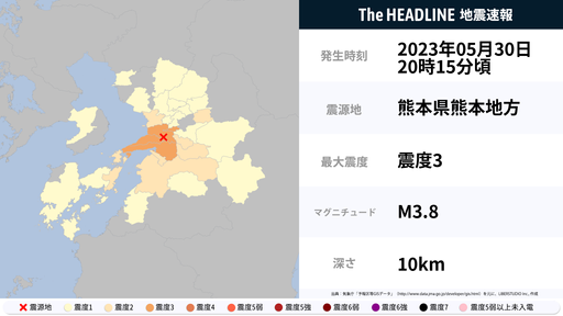 5月30日20時16分頃、熊本県で最大震度3の地震を観測