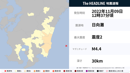 11月9日12時37分頃、宮崎県で最大震度2の地震を観測