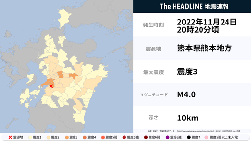 11月24日20時20分頃、熊本県で最大震度3の地震を観測