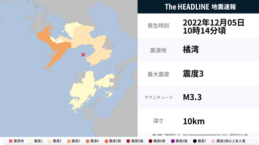 12月5日10時14分頃、長崎県で最大震度3の地震を観測