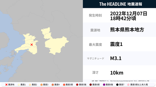 12月7日18時42分頃、熊本県で最大震度1の地震を観測