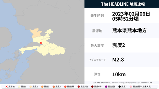 2月6日5時52分頃、熊本県で最大震度2の地震を観測