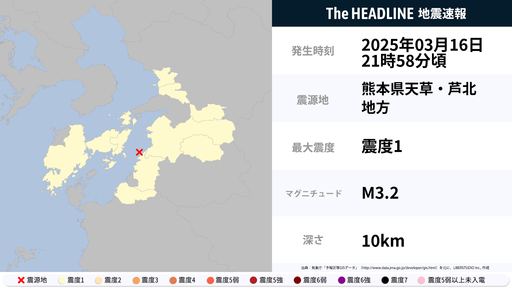 3月16日21時58分頃、熊本県で最大震度1の地震を観測