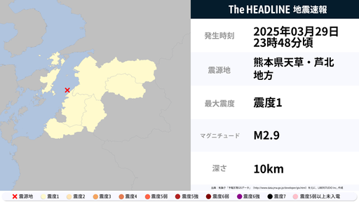 3月29日23時48分頃、熊本県で最大震度1の地震を観測