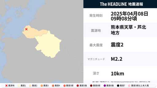 4月8日9時8分頃、熊本県で最大震度2の地震を観測