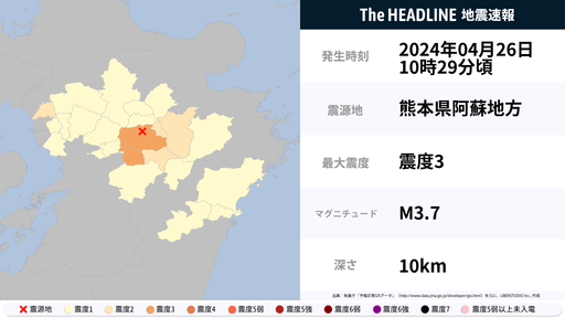 4月26日10時29分頃、熊本県で最大震度3の地震を観測