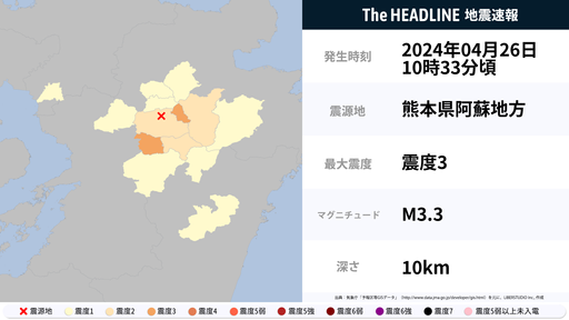 4月26日10時33分頃、熊本県で最大震度3の地震を観測
