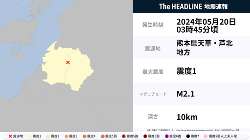 5月20日3時45分頃、熊本県で最大震度1の地震を観測