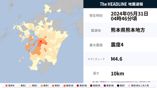 5月31日4時46分頃、熊本県・鹿児島県で最大震度4の地震を観測