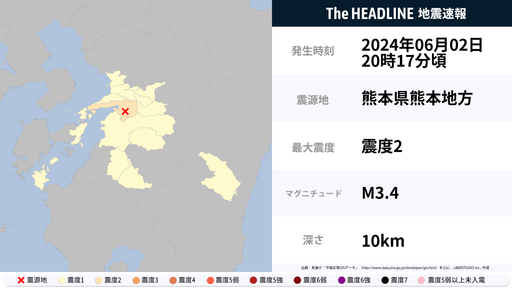 6月2日20時17分頃、熊本県で最大震度2の地震を観測