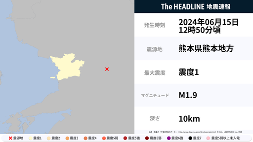 6月15日12時50分頃、熊本県で最大震度1の地震を観測