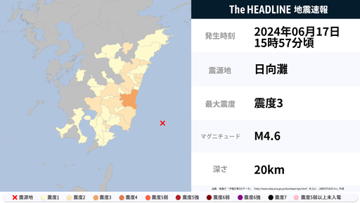 6月17日15時57分頃、宮崎県で最大震度3の地震を観測