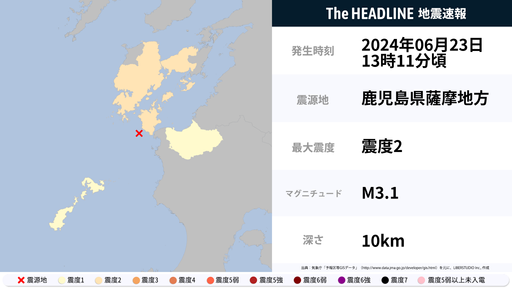 6月23日13時11分頃、熊本県・鹿児島県で最大震度2の地震を観測