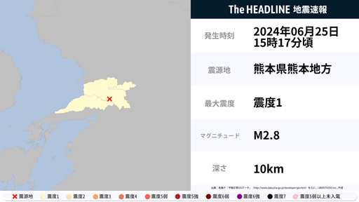 6月25日15時17分頃、熊本県で最大震度1の地震を観測