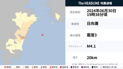 6月30日19時38分頃、宮崎県で最大震度3の地震を観測