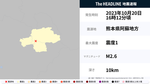 10月20日16時12分頃、熊本県で最大震度1の地震を観測