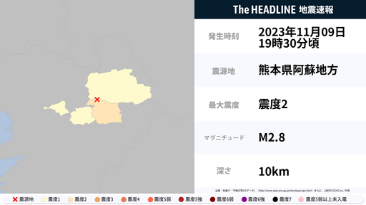 11月9日19時30分頃、熊本県で最大震度2の地震を観測