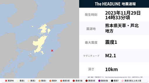 11月29日14時33分頃、熊本県で最大震度1の地震を観測