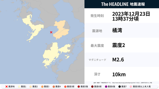 12月23日13時37分頃、長崎県で最大震度2の地震を観測