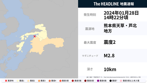 1月28日14時22分頃、熊本県で最大震度2の地震を観測