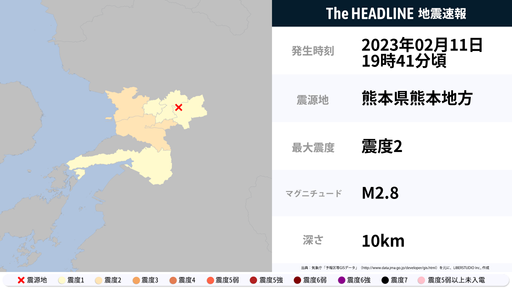2月11日19時41分頃、熊本県で最大震度2の地震を観測
