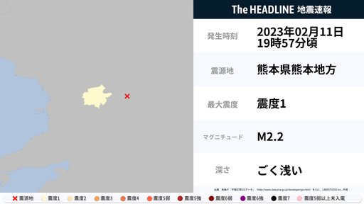 2月11日19時57分頃、熊本県で最大震度1の地震を観測