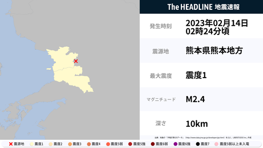 2月14日2時24分頃、熊本県で最大震度1の地震を観測