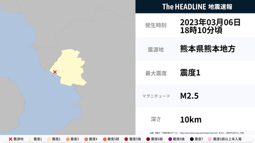 3月6日18時10分頃、熊本県で最大震度1の地震を観測