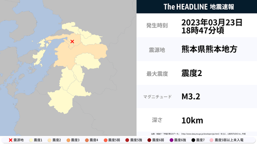 3月23日18時47分頃、熊本県で最大震度2の地震を観測