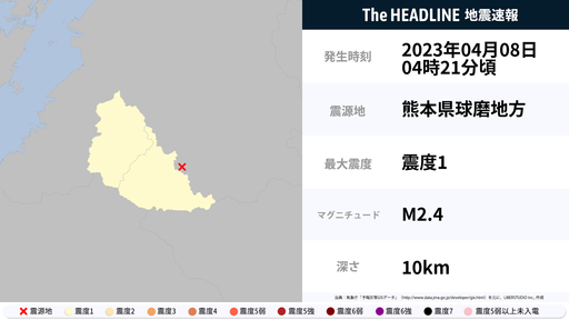 4月8日4時21分頃、熊本県で最大震度1の地震を観測
