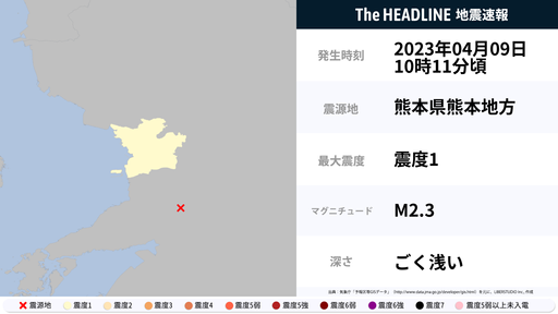 4月9日10時11分頃、熊本県で最大震度1の地震を観測