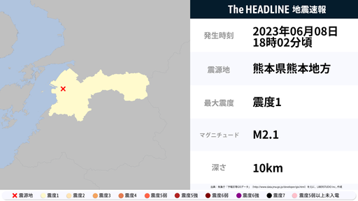 6月8日18時2分頃、熊本県で最大震度1の地震を観測