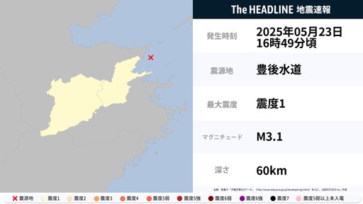 5月23日16時50分頃、大分県で最大震度1の地震を観測