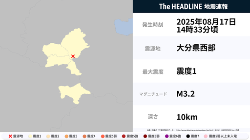 8月17日14時33分頃、熊本県・大分県で最大震度1の地震を観測