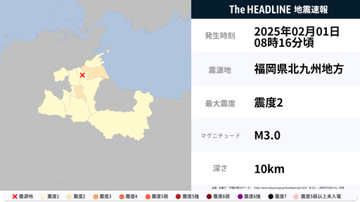 2月1日8時16分頃、福岡県で最大震度2の地震を観測