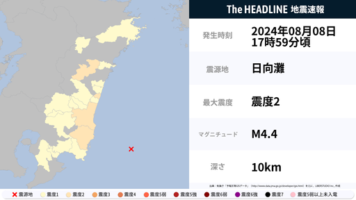 8月8日18時0分頃、宮崎県で最大震度2の地震を観測