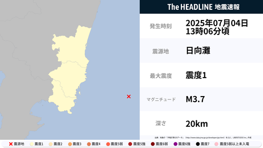 7月4日13時6分頃、宮崎県で最大震度1の地震を観測