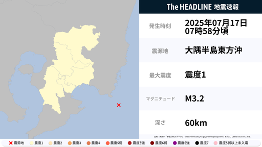 7月17日7時58分頃、宮崎県・鹿児島県で最大震度1の地震を観測